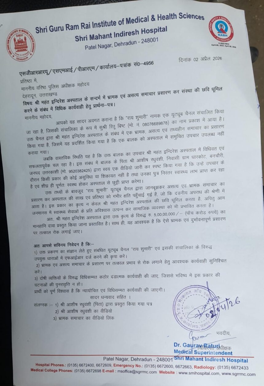 Fake YouTube News Row: Indresh Hospital to File ₹5 Crore Defamation Case in Dehradun देहरादून, 2 April 2026। सोशल मीडिया पर एक यूट्यूब चैनल द्वारा प्रसारित खबर अब विवादों में घिर गई है। मामले में श्री महंत इन्दिरेश अस्पताल ने कड़ा रुख अपनाते हुए वरिष्ठ पुलिस अधीक्षक को तहरीर सौंपकर चैनल के खिलाफ सख्त कार्रवाई की मांग की है। साथ…