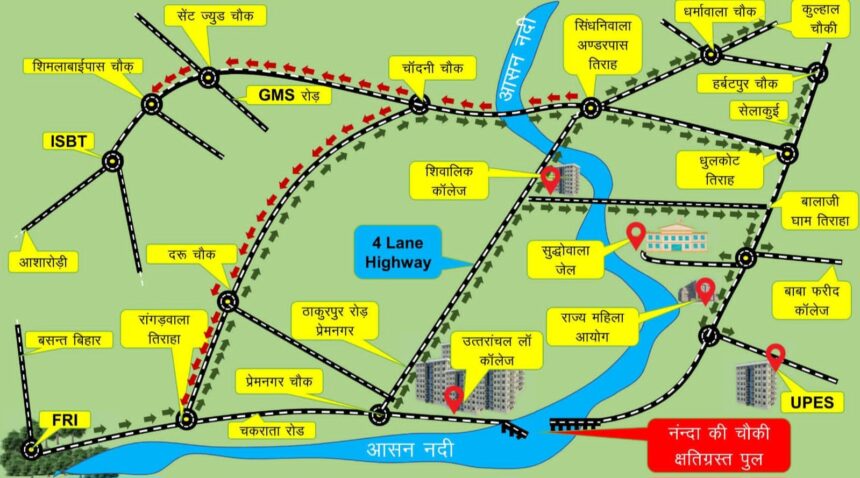 देहरादून, 21 सितंबर 2025 : 16 सितंबर को देहरादून में भारी बारिश के कारण नंदा की चौकी के समीप टॉर्च नदी पर बना पुल क्षतिग्रस्त हो गया। तब से देहरादून– विकास नगर पांवटा पर यातायात बाधित है। जिससे आमजन को भारी दिक्कतों का सामना करना पड़ रहा है। प्रेमनगर क्षेत्र में यातायात को सुचारू बनाने और जाम से बचने के लिए पुलिस प्रशासन ने ट्रैफिक डायवर्जन लागू किया है। अलग-अलग मार्गों पर जाने वालों के लिए वैकल्पिक रूट तय किए गए हैं। यातायात विभाग ने यात्रियों से अपील की है कि वे निर्धारित मार्गों का ही उपयोग करें।