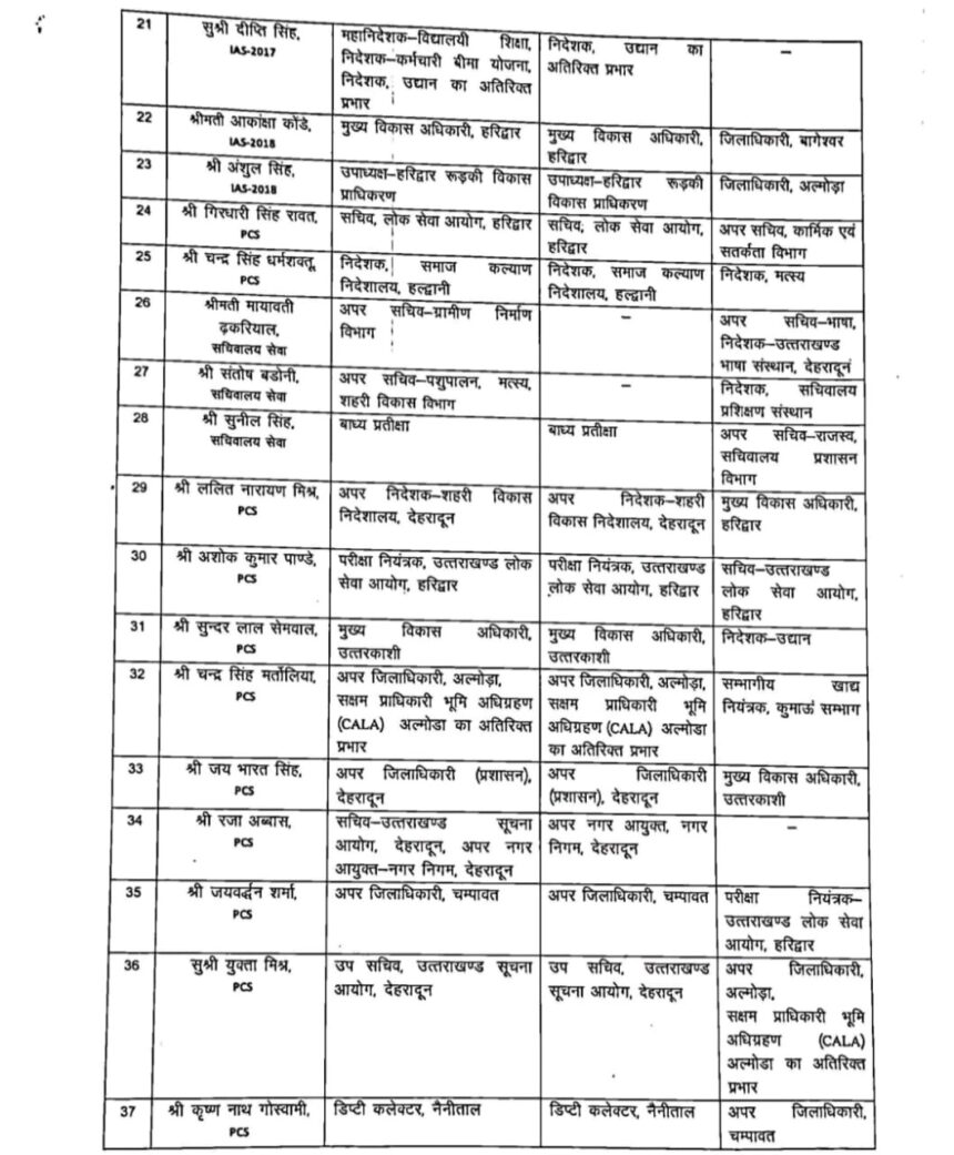 वहीं सचिव स्तर पर भी फेरबदल हुआ है। डॉ. संदीप तिवारी को समाज कल्याण विभाग का निदेशक बनाया गया है, जबकि पिथौरागढ़ के पूर्व डीएम विनोद गिरि गोस्वामी अब शहरी विकास विभाग के सचिव और निदेशक होंगे। पूर्व अल्मोड़ा डीएम आलोक पांडे प्रधानमंत्री ग्राम सड़क योजना के सीईओ बनाए गए हैं।