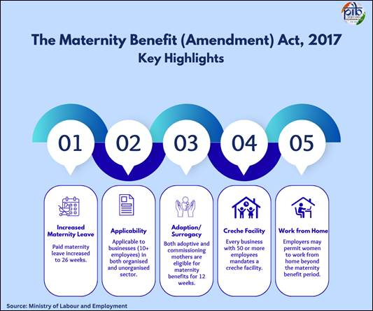- मातृत्व लाभ अधिनियम (2017) – अवकाश 26 सप्ताह और शिशुगृह की सुविधा।