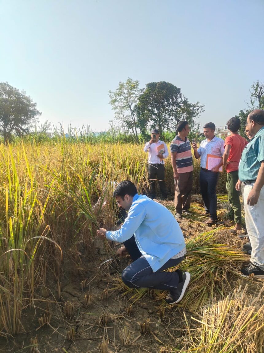 Meta Description: Dehradun DM Savin Bansal joined farmers in harvesting rice during a crop-cutting experiment at Arkadiya Grant village, highlighting the importance of data-based farming.